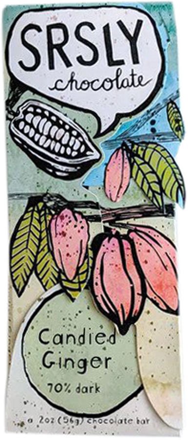 SRSLY's take on a traditional pairing. Diced crystallized ginger tops each 70% bar. The ginger kick pairs perfectly with their fruit-forward Dominican Republic cacao beans.