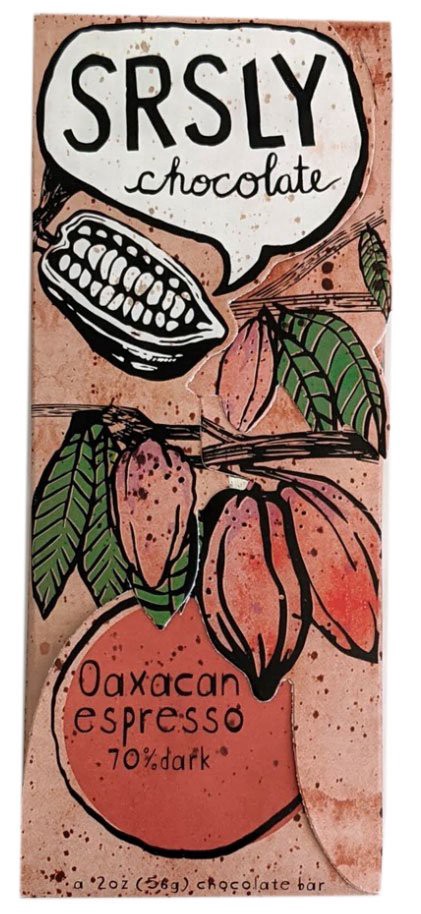 SRSLY added organic Mexican chipotle pepper and organic coffee to their classic 70% bar. Smoke and fruit dominate the beginning. A warm, complex coffee and chocolate middle note that gives way to a sp…