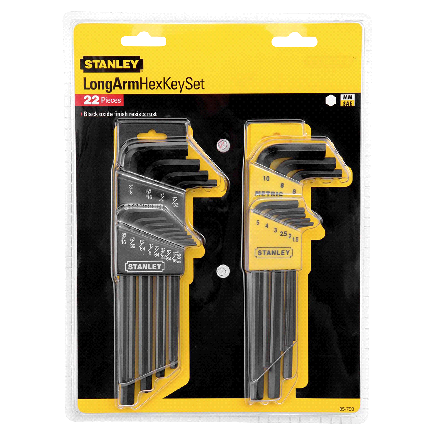 STANLEY 22 pc Hex Key Set includes 22 strong steel, rust-resistant hex keys in many popular SAE and metric sizes. This handy set comes with two labeled holders that make it easy to find exactly the si…