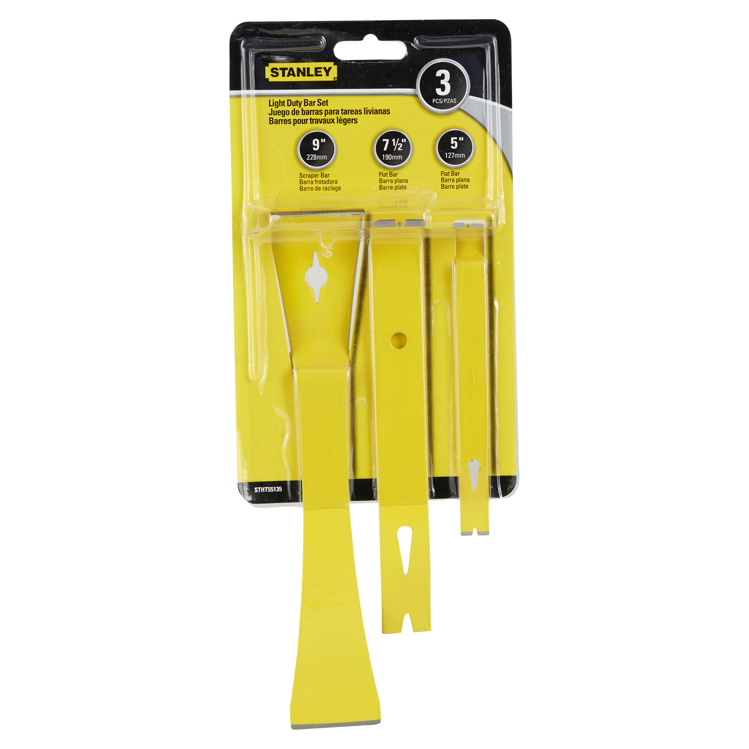 STANLEY 3 pc. LightDuty Pry Bar Set comes with three bar sizes to use for multiple applications. Stamped onepiece steel construction with teardrop nail pullers for easy nail removal. Lightweight desig…