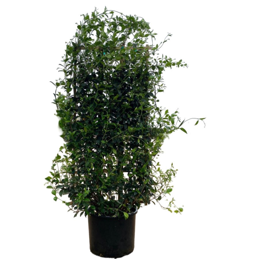 This strong growing shrub or vine has shiny dark green leaves. Masses of fragrant, star-shaped white flowers bloom in spring. Makes an excellent accent plant. Deer and drought tolerant.