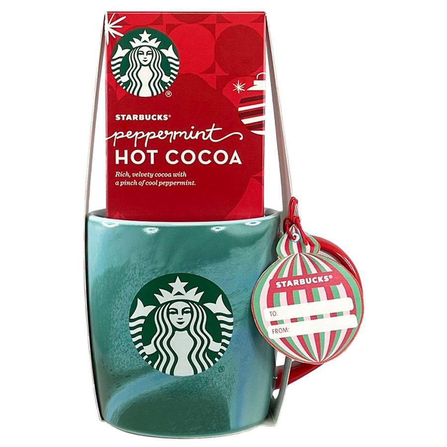 Give a gift that keeps giving! This Starbucks Holiday Mug Gift Set will delight you or a loved one! It includes a green Starbucks mug and rich, velvety cocoa with a pinch of cool peppermint.