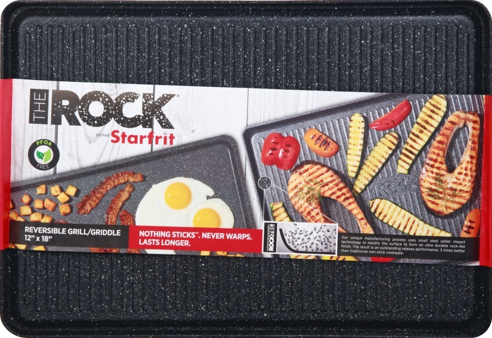 The Starfrit reversible two burner grill / griddle with deep ribbing drains grease for healthier burgers, steaks, fish and