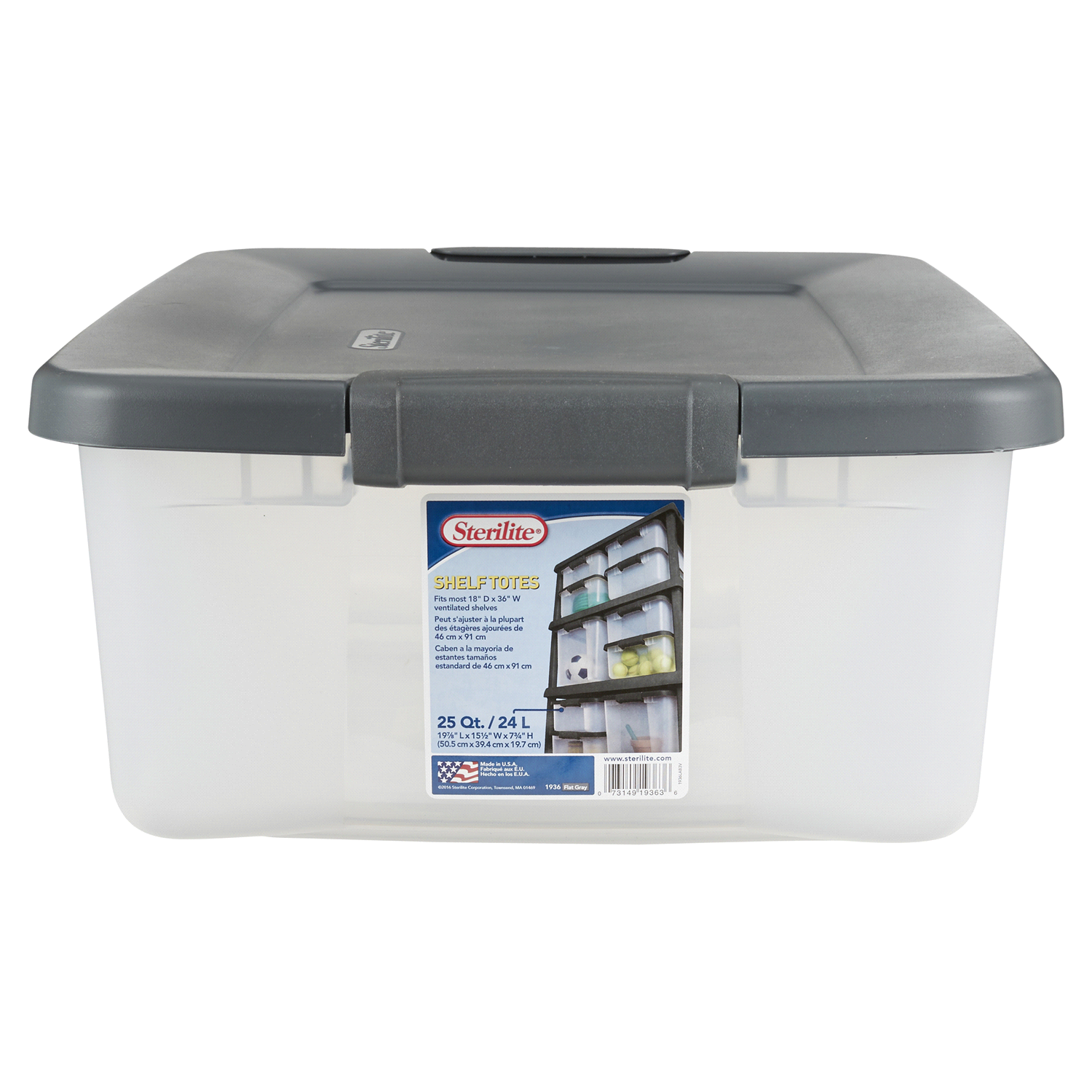 The 25 Quart ShelfTotes is designed to fit on Sterilite’s 5-shelf ventilated shelving unit to maximize the vertical space in a garage or basement setting.