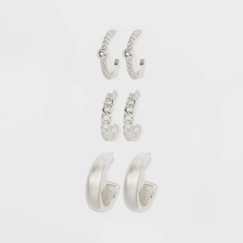 This Sterling Silver Cubic Zirconia Hoop Drop Earring Set from A New Day™ lets you keep it simple and chic with ease. This set includes three pairs of sterling silver partial hoop earrings in classic …
