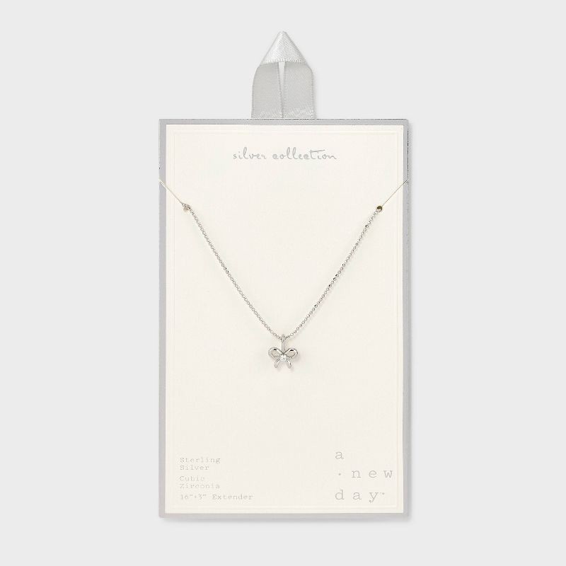 Get ready to shine wherever you go by accessorizing with the Sterling Silver Polished Bow with Center Cubic Zirconia Pendant Necklace from A New Day™. This sterling silver pendant necklace features a …