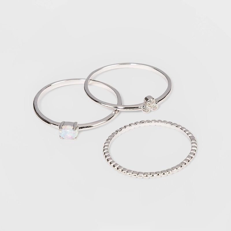 Create a look as unique as you with this Sterling Silver with Opal and Cubic Zirconia Beaded Band Stacking Ring Set from A New Day™. Crafted in a sterling silver-finished setting with studded opal and…