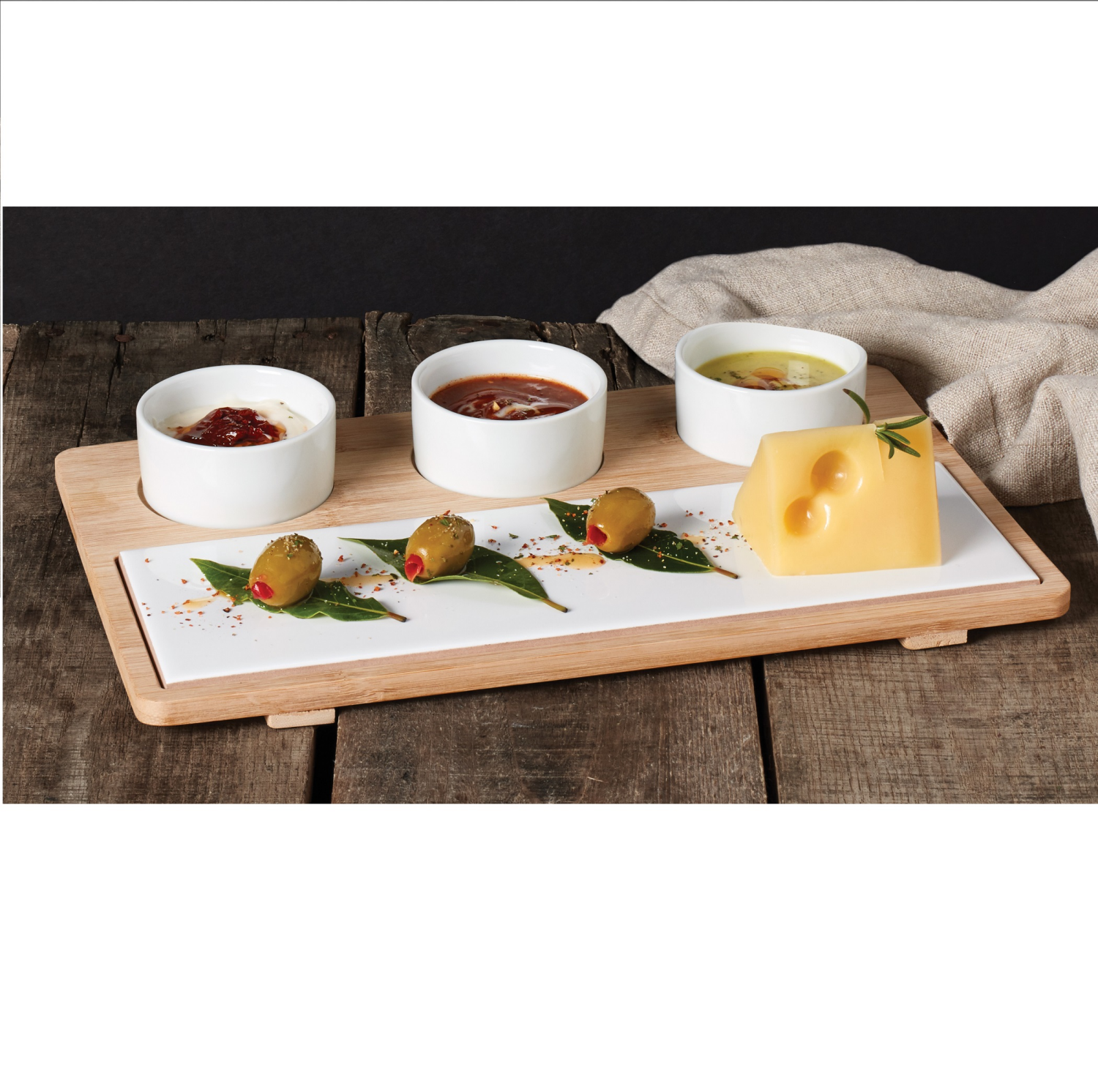 Beautifully display your favorite tapas or charcuterie boards with this 5-piece serving set from Denmark Tools for Cooks. This set features a gorgeous bamboo serving board with a white stoneware tray …