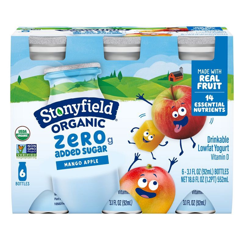 - DRINKABLE YOGURT: Six 3.1 fl oz bottles of Stonyfield Organic Zero Grams Added Sugar Mango Apple Drinkable Lowfat Yogurt