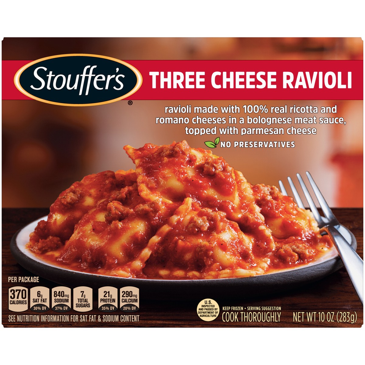 Ravioli made with 100% real ricotta and romano cheeses in a bolognese meat sauce, topped with parmesan cheese. Per package: 370 calories; 6g sat fat (30%DV); 840mg sodium (37%DV); 7g total sugars; 21g…