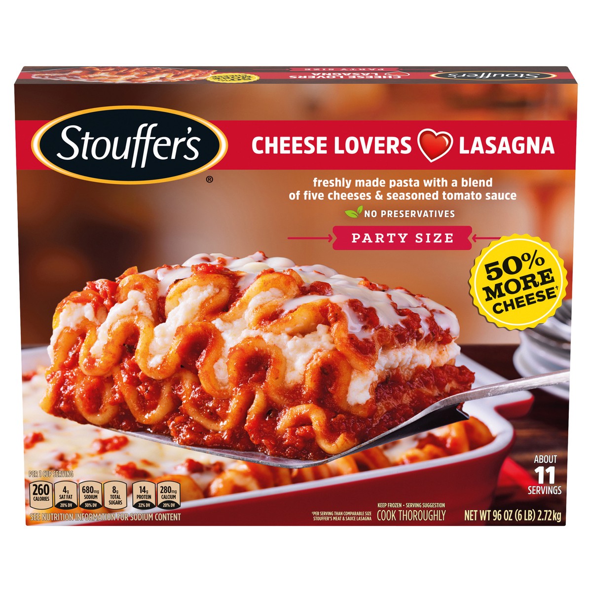 Stouffer's Party Size Cheese Lovers Lasagna Frozen Meal combines quality ingredients and delicious flavor into one easy dinner. This Stouffers lasagna is made with lasagna noodles, seasoned tomato sau…