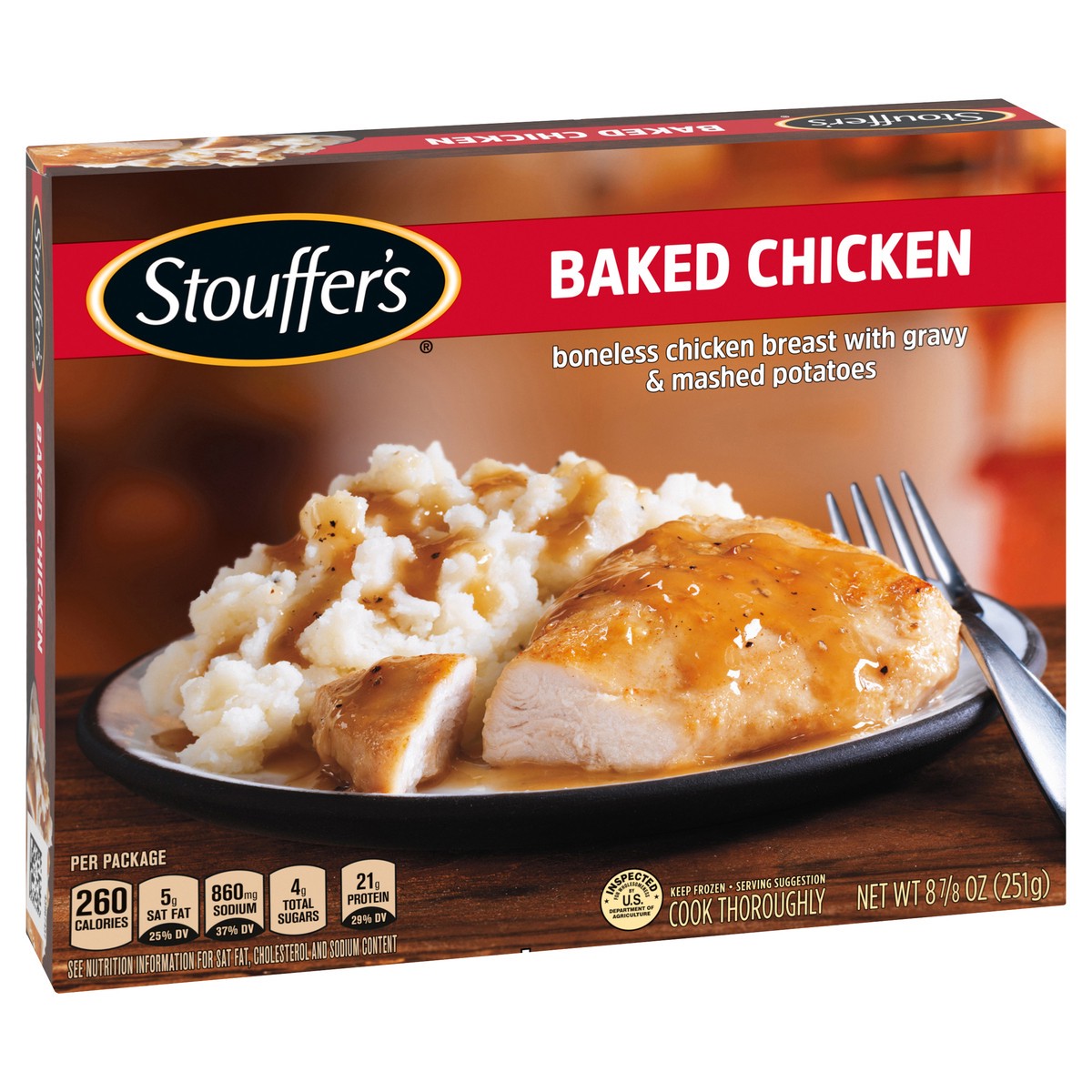 Stouffer's Baked Chicken Frozen Meal offers a quick, easy solution for lunch or dinner. This cook and serve dinner includes boneless chicken breast with gravy and mashed potatoes, sure to satisfy your…