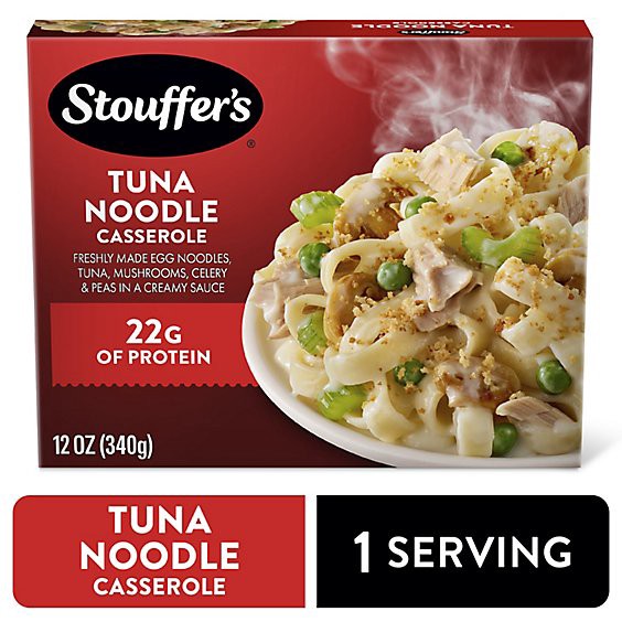Stouffer's Tuna Noodle Casserole Frozen Meal offers a quick, easy solution for lunch or dinner. The frozen dinners for one include freshly made egg noodles, tuna, mushrooms, celery, and peas in a crea…