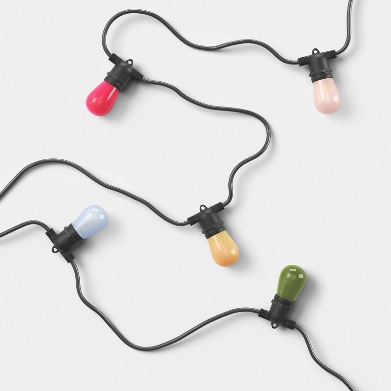 Add warm lighting to your porch or patio space with these Colored Cafe String Lights from Threshold™. Designed for outdoor use, these lights feature a black string with 10 bulbs in different colors. T…