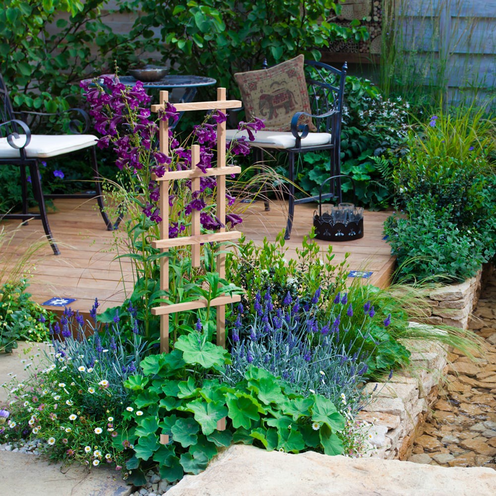 Heavy duty cedar lumber provides for a long lasting beautiful trellis to your patio or landscape. Pointed stakes for easy insertion into a patio container or in your garden. All cross pieces are doubl…