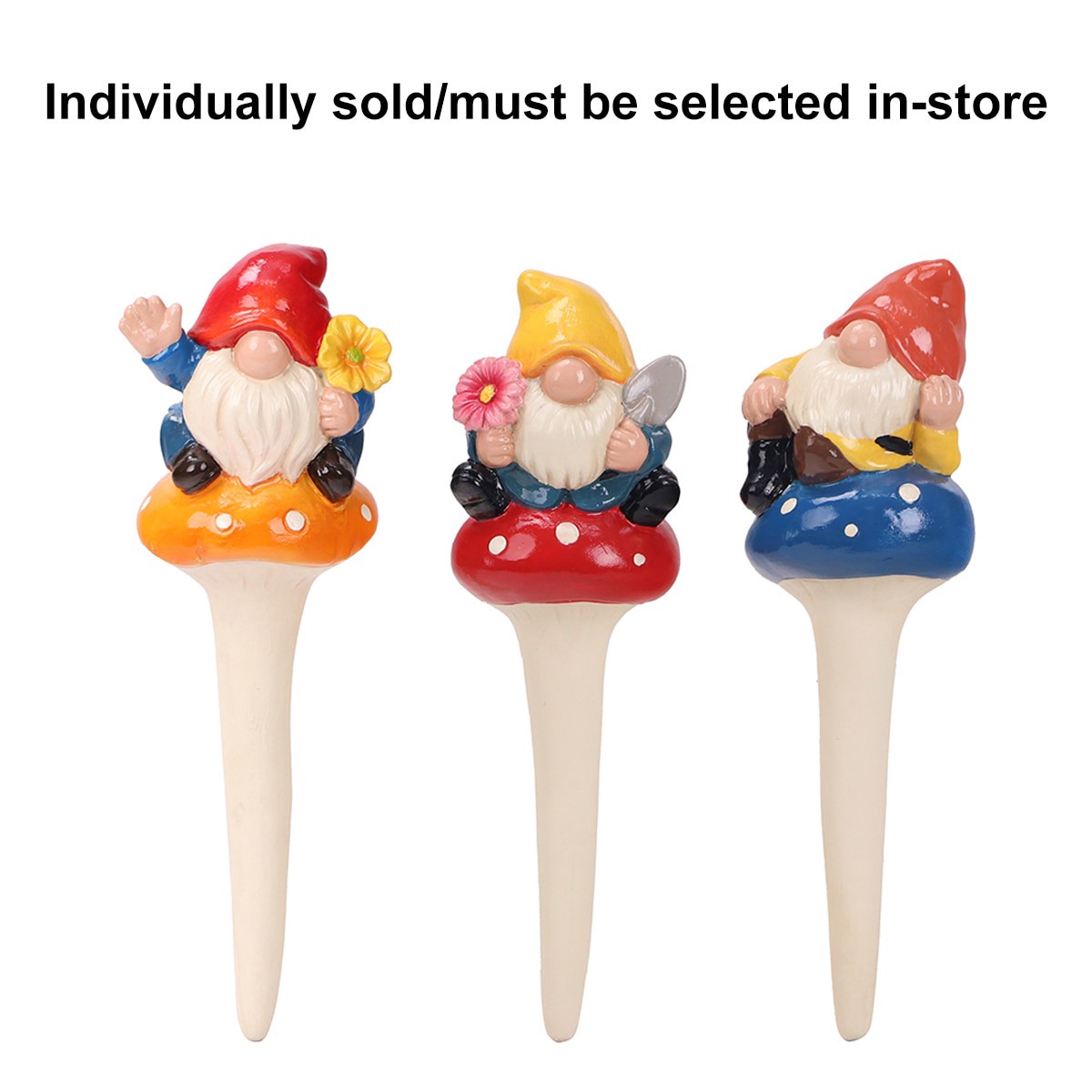 Individually sold/must select in-store. Whimsical gnome on mushroom pot stakes are perfect for use in potted plants or flower beds. Beautifully sculpted in heavy duty resin.