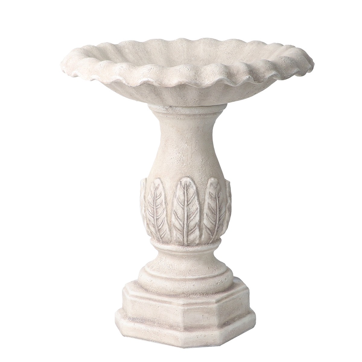 Textured white washed stone finish. Beautiful leaf motif on the birdbath post. Highly detailed sculpture. Defect addition to the yard. Durable resin material.
