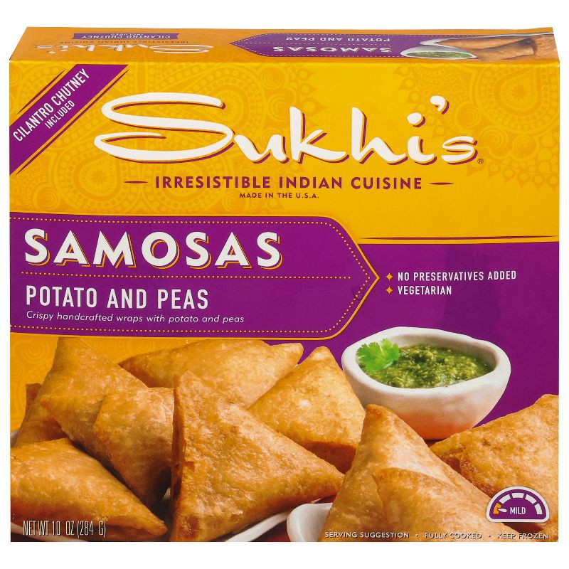 Sukhi's Potato & Pea Samosas are crispy handcrafted vegetarian triangles filled with delicious seasoned potato, pea, and spices. Savory goodness in every bite, Sukhi's frozen samosas make a great appe…