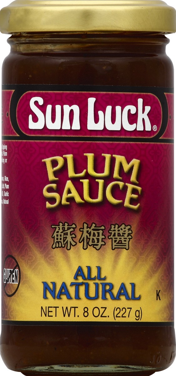 All natural, gluten free. Sun Luck Golden Plum Sauce is a delicious dipping sauce for roast duck, BBQ pork and egg rolls. Plum sauce can also be used as a glaze when broiling or roasting poultry and p…