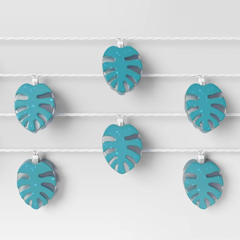 Add a fun touch of tropical twinkle to your indoor or outdoor space with these 10-Count Incandescent Leaves Figural String Lights from Sun Squad™. Ten palm leaf-shaped lights in teal blue with clear m…