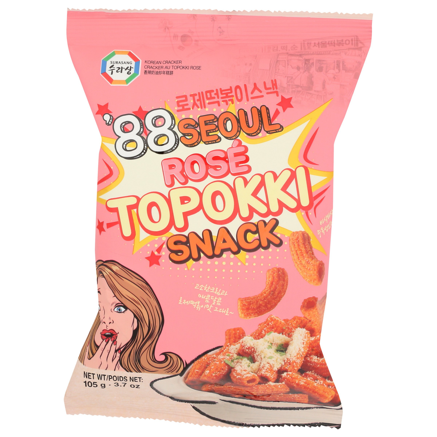 This crunchy, spicy snack from Surasang captures the essence of Korea's beloved Topokki in a to-go form. These bite-sized, rice-based snacks are seasoned with a gochujang-infused powder, offering a bu…