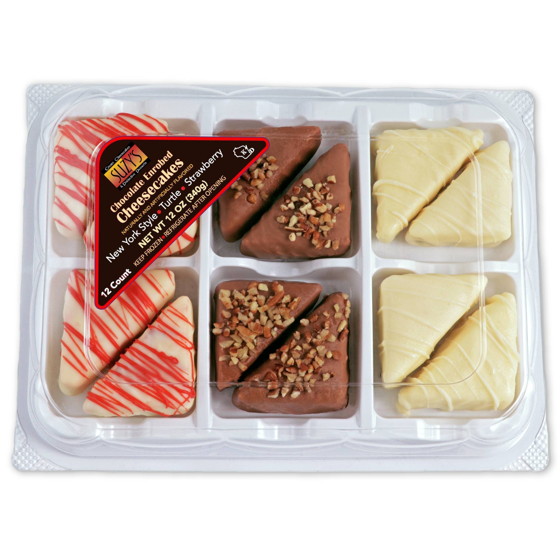 Three of Suzy’s most popular cheesecake flavors portioned into single serving triangles, covered in milk chocolate and topped off with a chocolate drizzle. Made with real cream cheese, Suzy’s Chocolat…