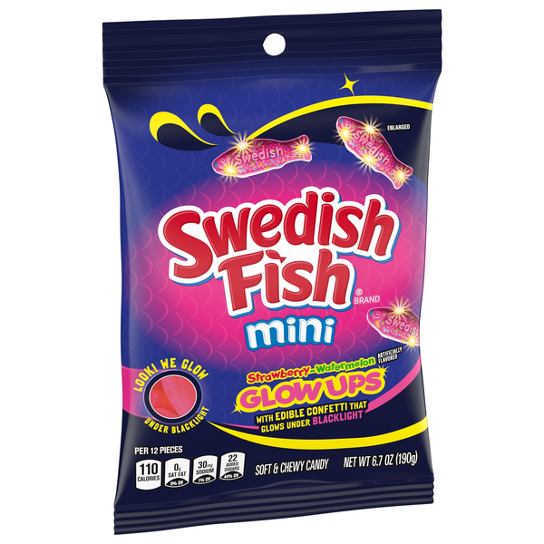 Shine a light on your next snacking session with SWEDISH FISH Mini Glow Ups Strawberry-Watermelon Soft & Chewy Candy. These fun, fish-shaped candy gummies feature edible confetti that glows under blac…