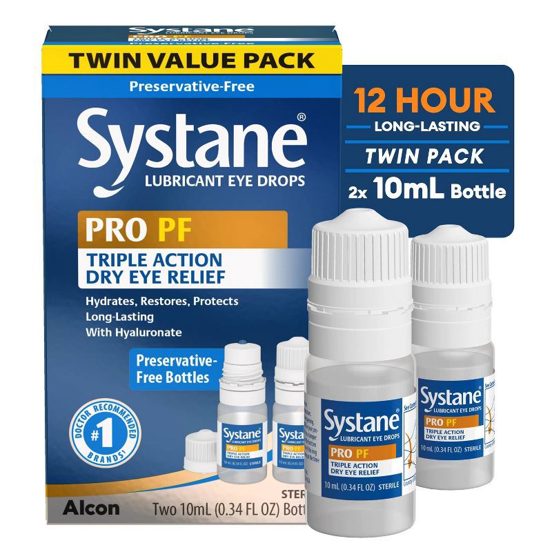 Systane® PRO Preservative Free Lubricating Eye Drops feature a triple-action formula that helps hydrate, restore, and protect dry eyes for up to 12 hours of relief. Helps soothe irritation caused by e…