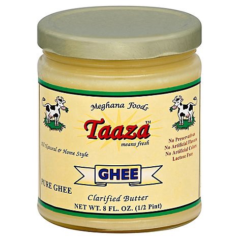 Taaza means fresh. All natural & home style. No preservatives. No artificial flavors. No artificial colors. Lactose free. Pure ghee. Ghee is clarified butter. Our ghee is made from fresh Grade AA butt…