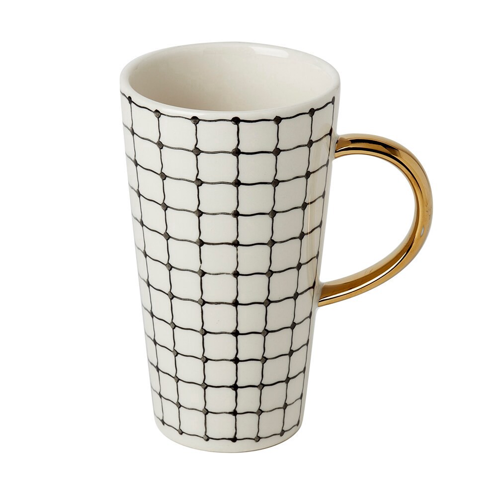 Savor your favorite coffee or tea in style with this 22.6-ounce mug from Tabletops Gallery. Featuring a fun grid pattern and a gold handle, this mug feels elegant and elevated.22.6-ounce capacity, 5.4…