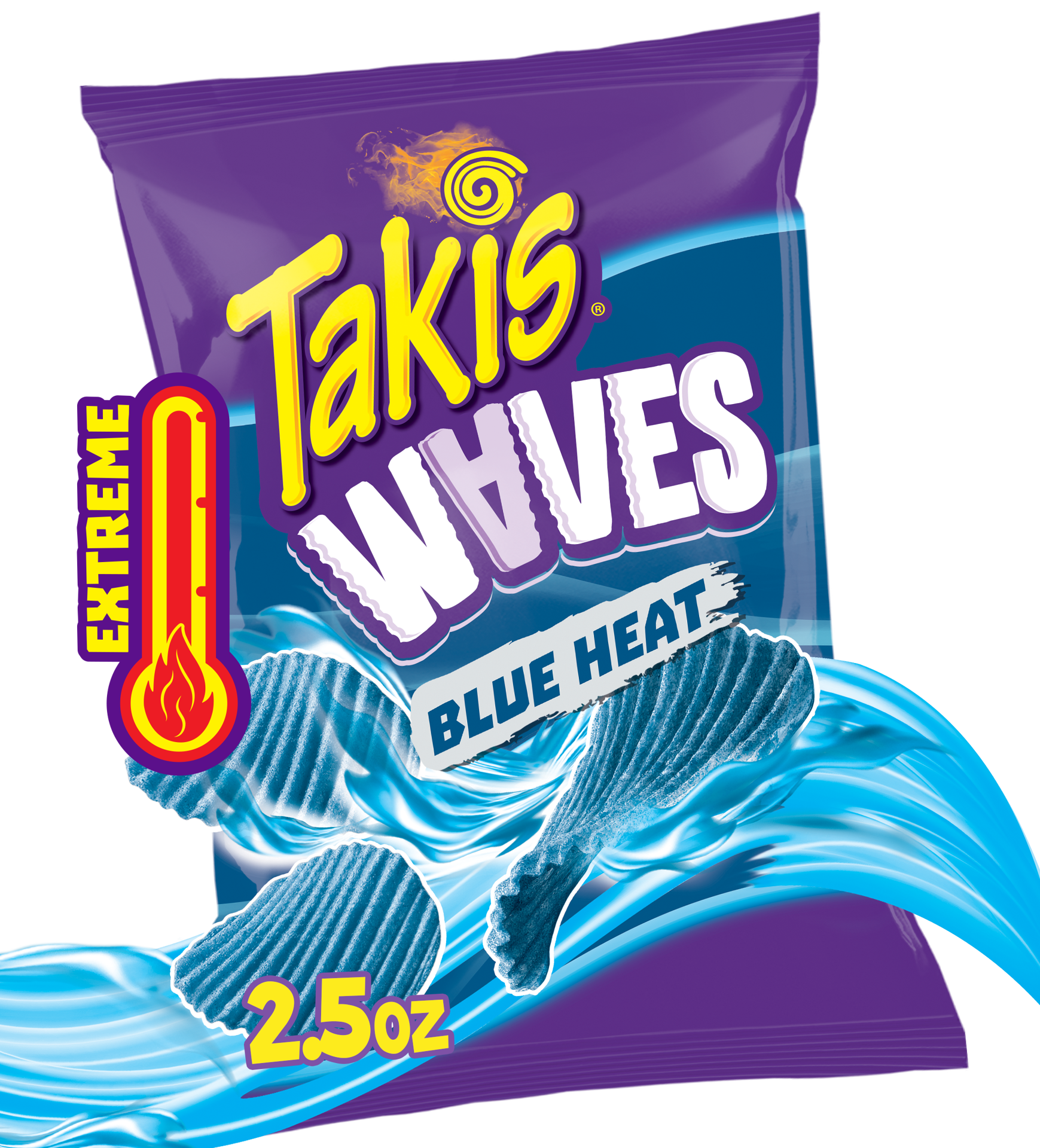 HOT CHILI PEPPER WAVY POTATO CHIPS. ARTIFICIALLY FLAVORED. PER 1 OZ: 150 CALORIES; 1.5 G SAT FAT (8% DV); 189 MG SODIUM (8% DV); 0 G TOTAL SUGARS. NEW. BLUE HEAT. WWW.TAKIS.US. SCAN FOR MORE FOOD INFO…