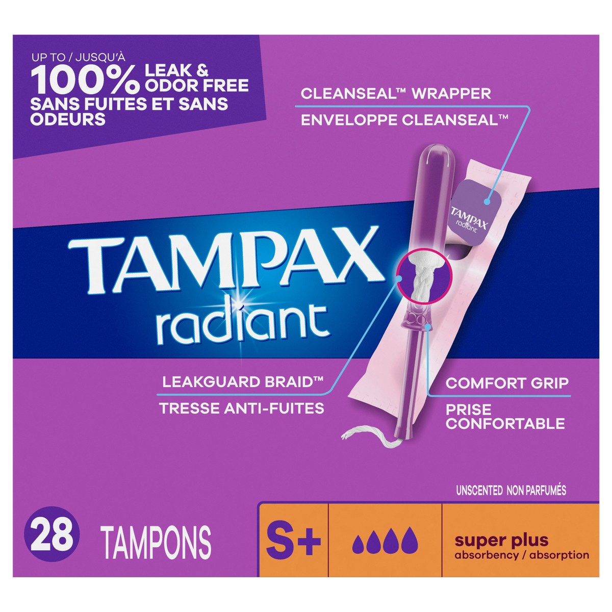 It's a new time for that time of the month. Get up to 100% leak and odor-free protection with Tampax Radiant tampons designed with a LeakGuard Braid to help stop leaks before they even happen. For pro…