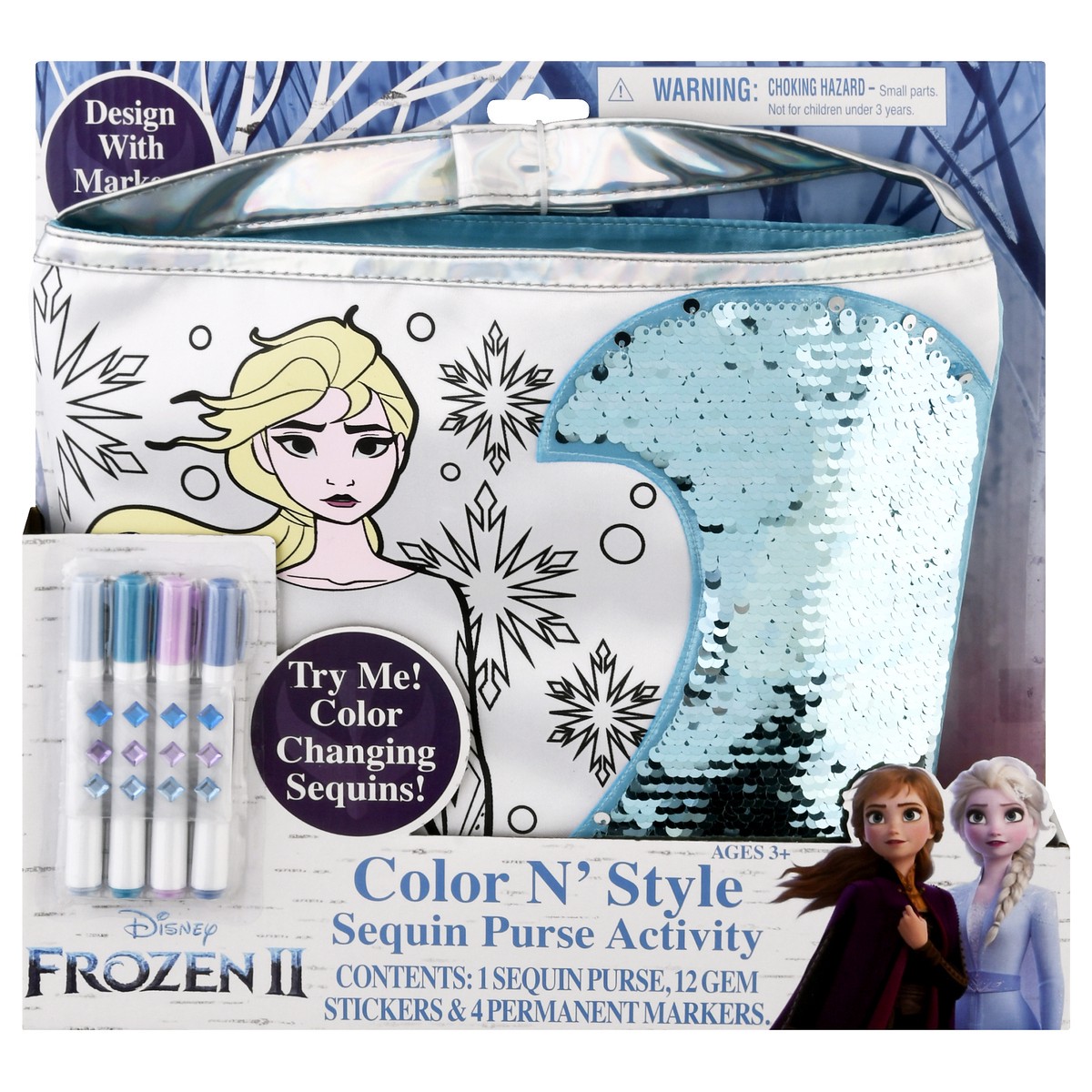 Color your very own Frozen 2 purse with colorful permanent markers and design with gem stickers. Purse features color changing sequins! Simply move sequins up or down to create a different look. Inclu…