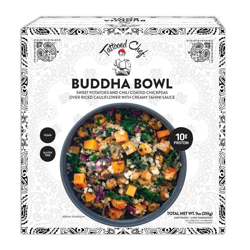 Tattooed Cheff Buddha BowlA balanced, flavorful meal featuring sweet potatoes, chili-coated chickpeas, and riced cauliflower with a creamy tahini sauce. This vegan delight is ready in minutes, offerin…