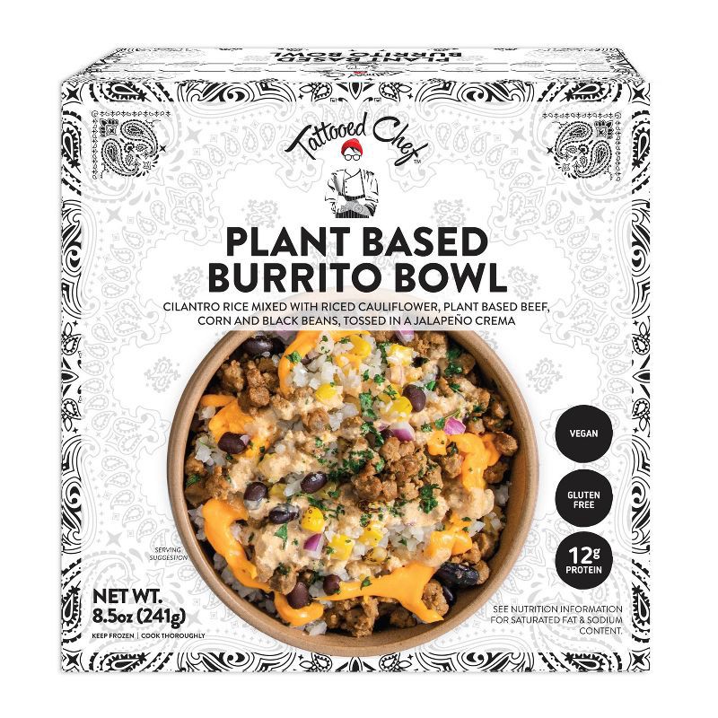 Tattooed Chef Burrito BowlTasty, plant-based, and with just the right amount of spice. This bowl features cilantro rice, riced cauliflower, plant-based beef, roasted corn, and black beans in a jalapeñ…