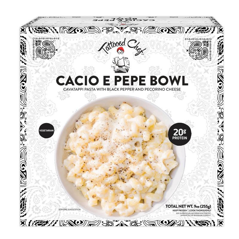 Tattood Chef Cacio E Pepe Bowl A beloved Italian classic, reimagined. Cavatappi pasta in a creamy Pecorino cheese and pepper sauce, topped with grated parmesan. This dish offers real Italian ingredien…