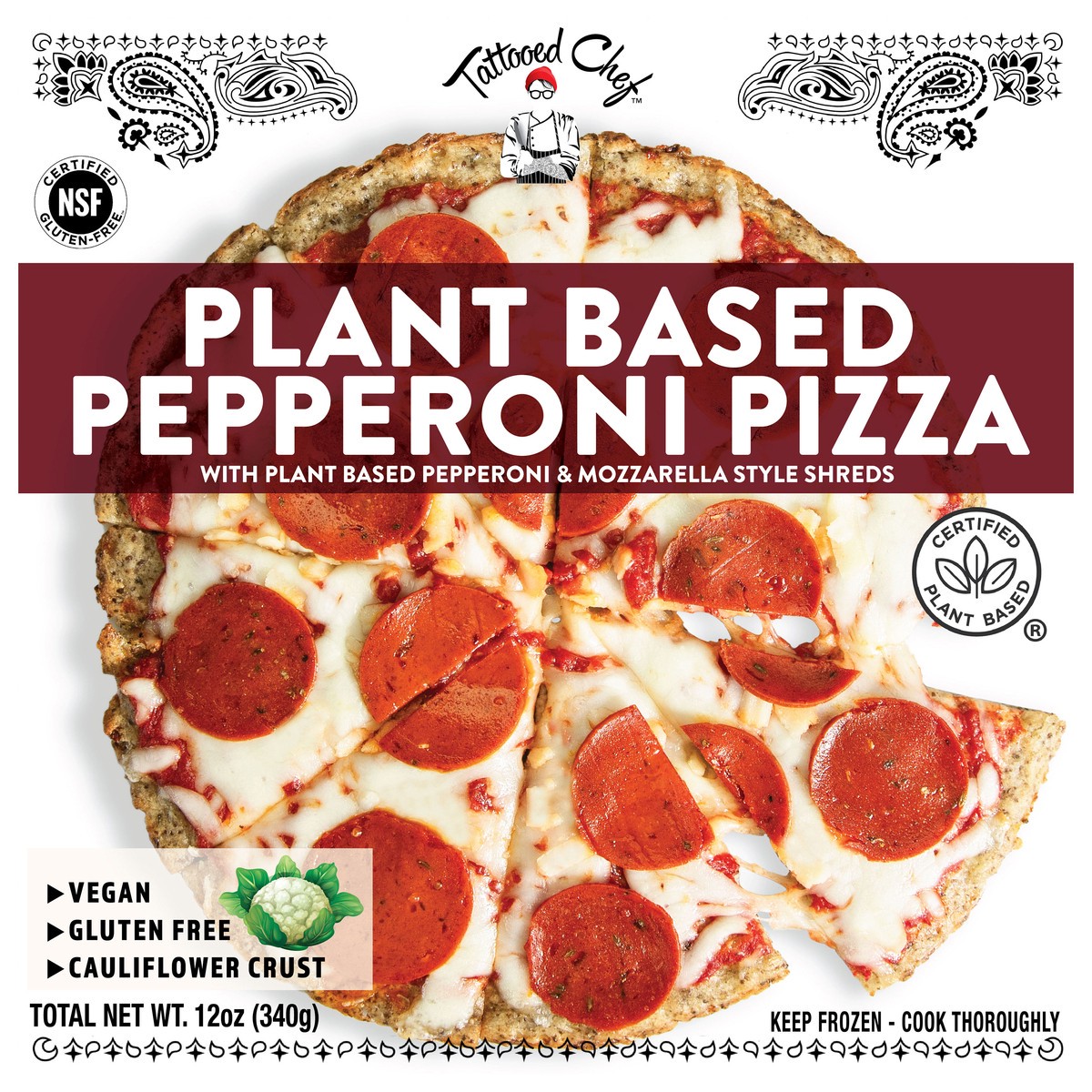 Sliced plant based pepperoni on a cauliflower crust with a tomato sauce and mozzarella style vegan cheese. Growing and making plant based eats by thoughtfully creating food that feels good. At Tattooe…
