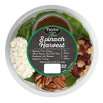 Spinach, feta cheese, spinach candied pecans, dried cranberries, sun dried pears. 300 calories. 8 g protein. See nutrition information for total fat and sodium content. Fork included. Produce washed a…