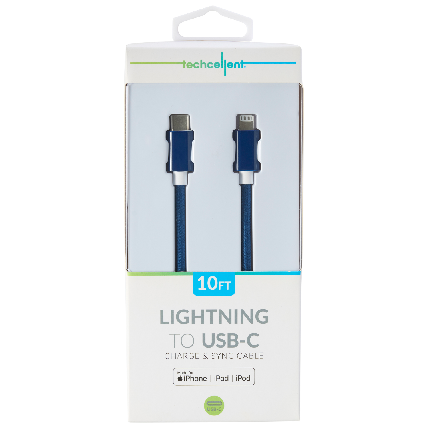 Techcellent Lightning To USB-C Charge & Sync Braided Cable, 10ft NAVY