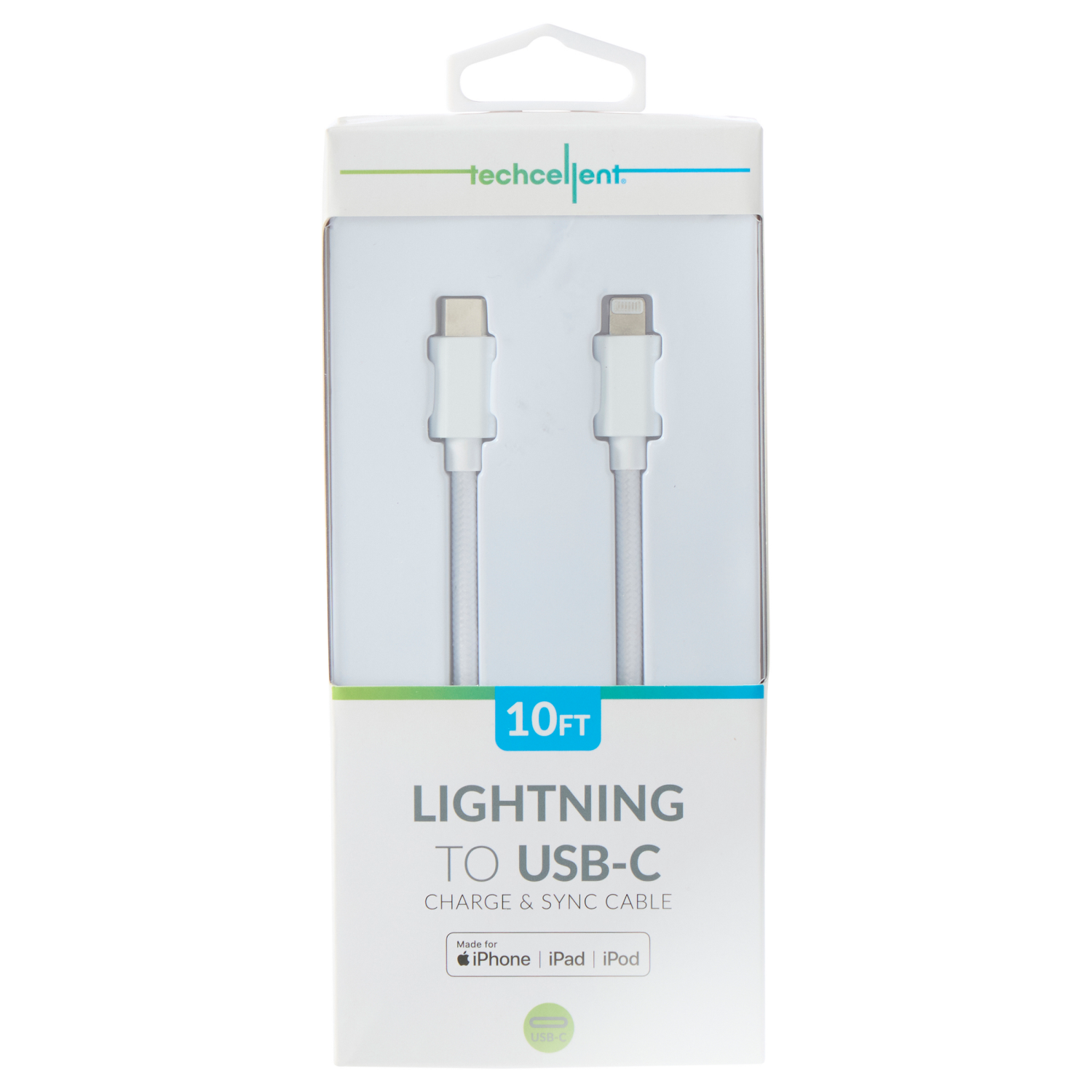 Techcellent Lightning To USB-C Charge & Sync Braided Cable, 10ft WHITE