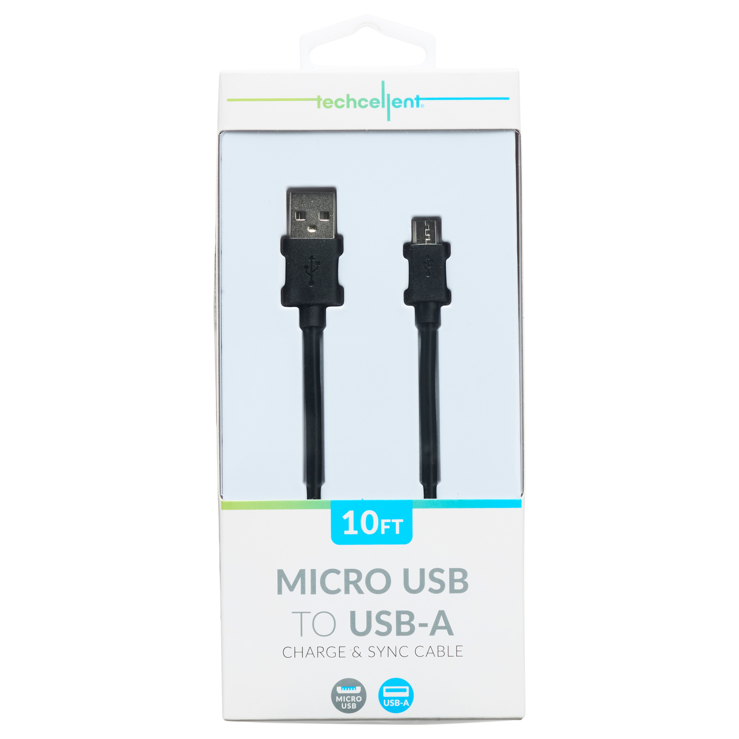 slide 4 of 5, Techcellent USB-A To Micro Charge & Sync PVC Cable , 10FT, Black, 10 ft