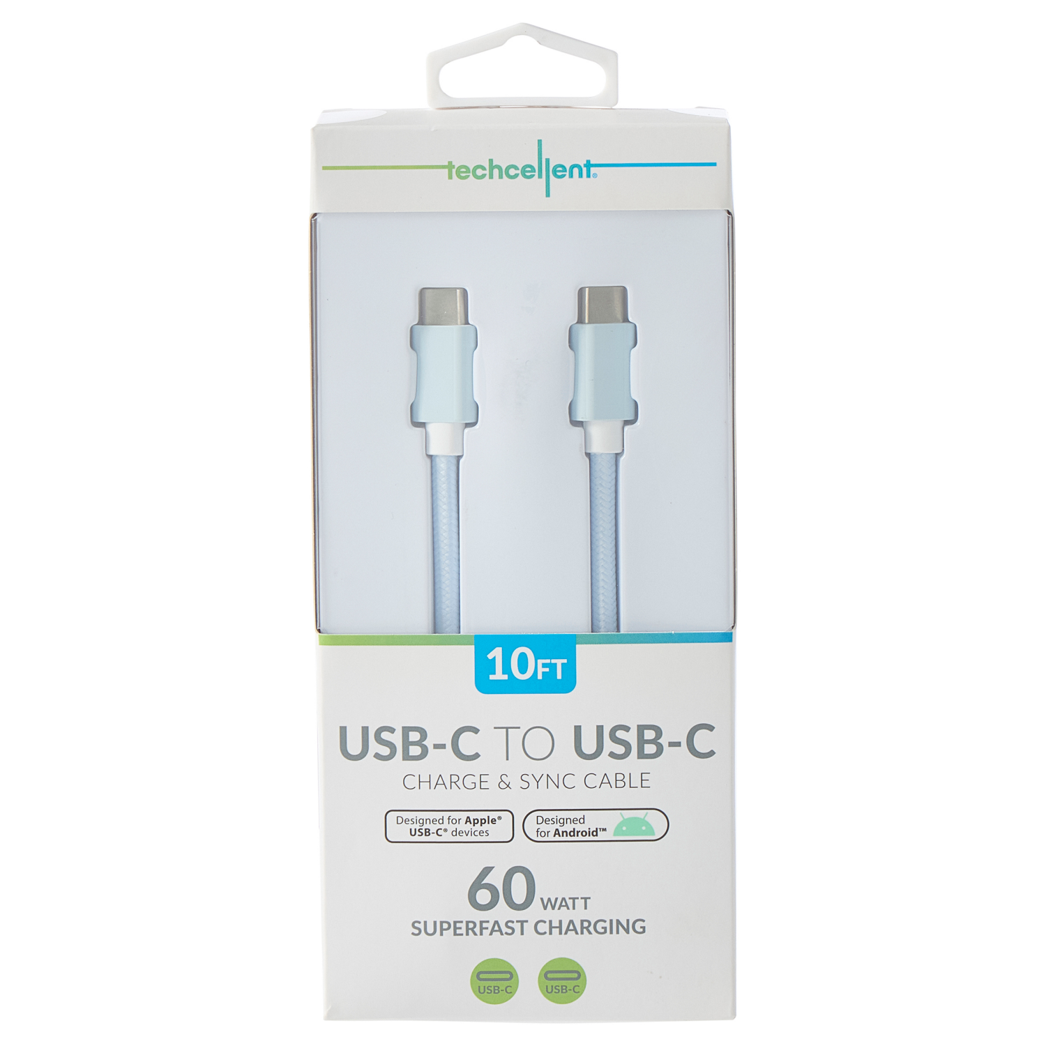 TECHCELLENT USB-C to USB-C Charge & Sync Fabric Cable, 10ft Blue