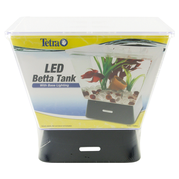 Tetra LED Betta Tank is a clear plastic trapezoid shaped tank with clear plastic canopy and feeding hole. Holds 1 gallon of water and is ideal for the Aquarist with limited space.