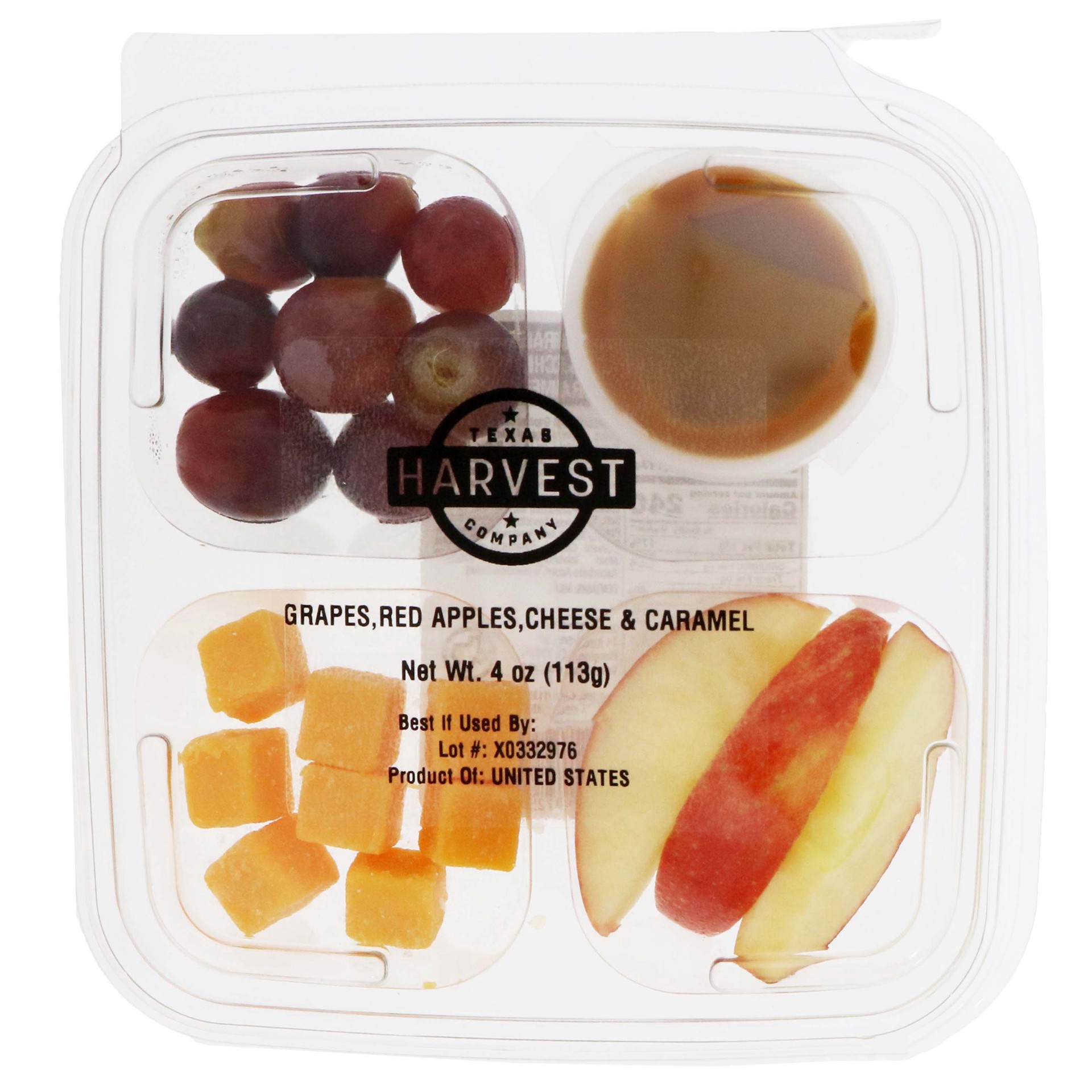 Prepared for grab and go convenience our Texas Harvest handmade snack tray includes red apples and grapes with cheese cubes and caramel sauce for dipping. Ready to eat and enjoy