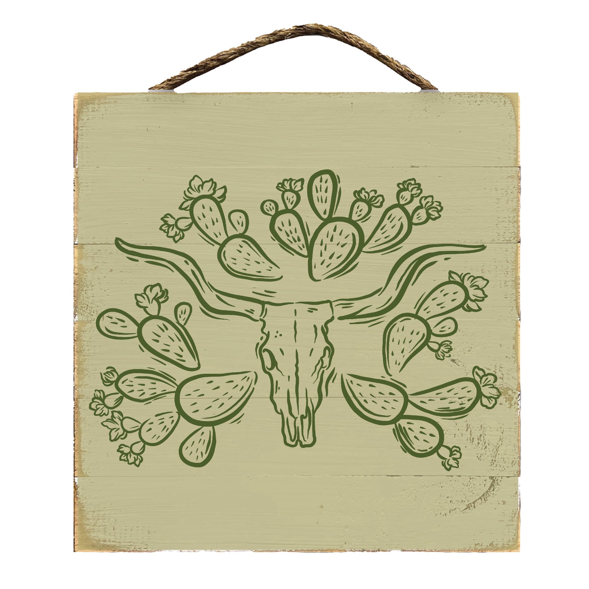 Enhance your home decor with the Texas Proud Cactus Longhorn Hanging Wall Sign. Measuring 12" by 12", this hanging slat sign features a branded cactus and longhorn design in green, adding a unique and…