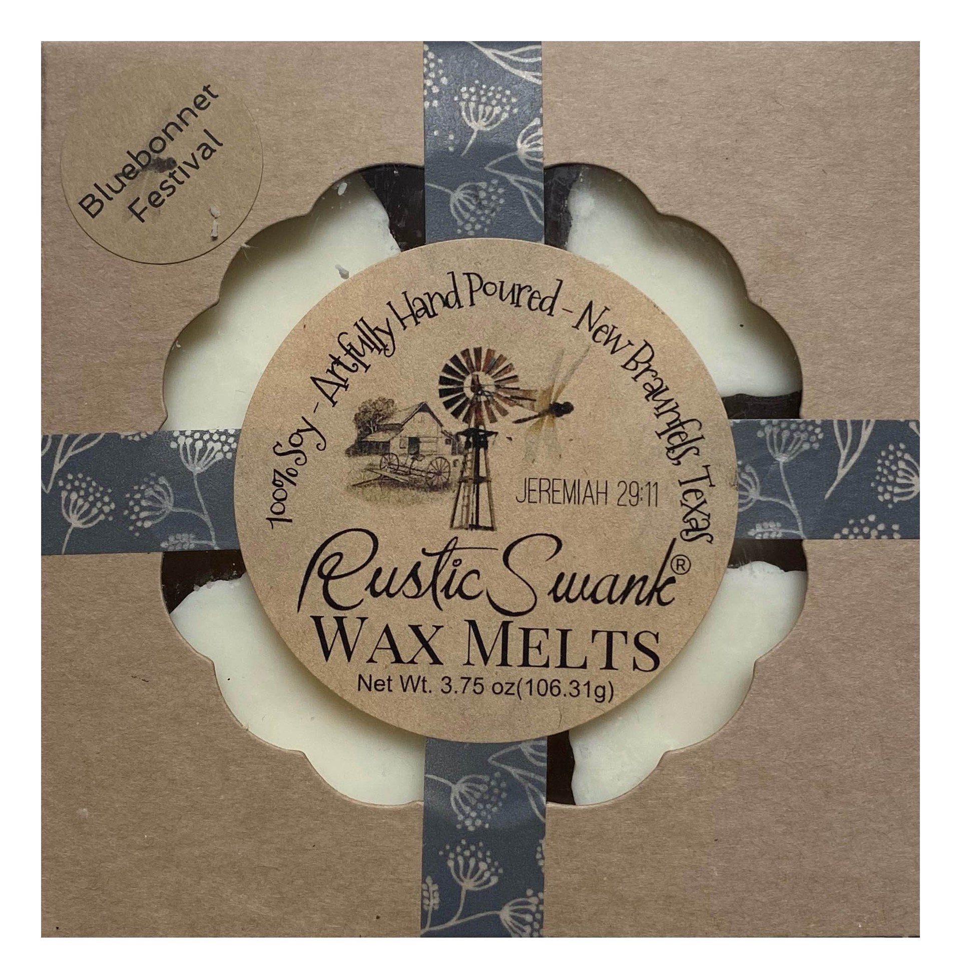 These Rustic Swank wax melts are made with 100% soy in our custom blended Bluebonnet Festival scent. There are no added phthalates, hardening agents, whitening agents or dyes. Each box contains 5 indiā¦