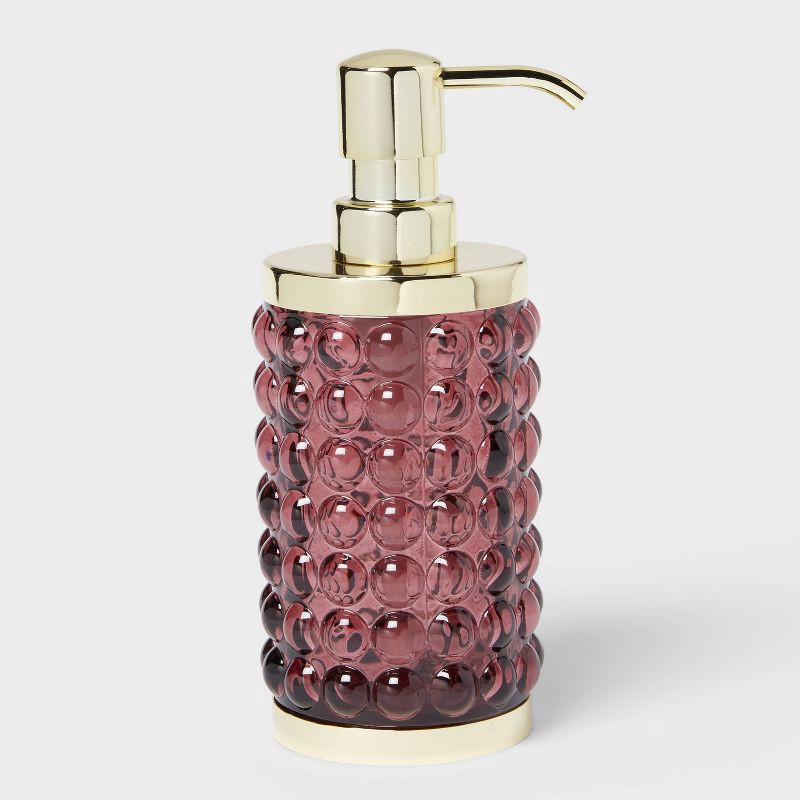 Enhance your bathroom aesthetics with this Textured Glass Soap Pump from Threshold™. Made of glass, this soap pump features a gold-tone base and dispenser for elegant charm, while the bubble-like rais…