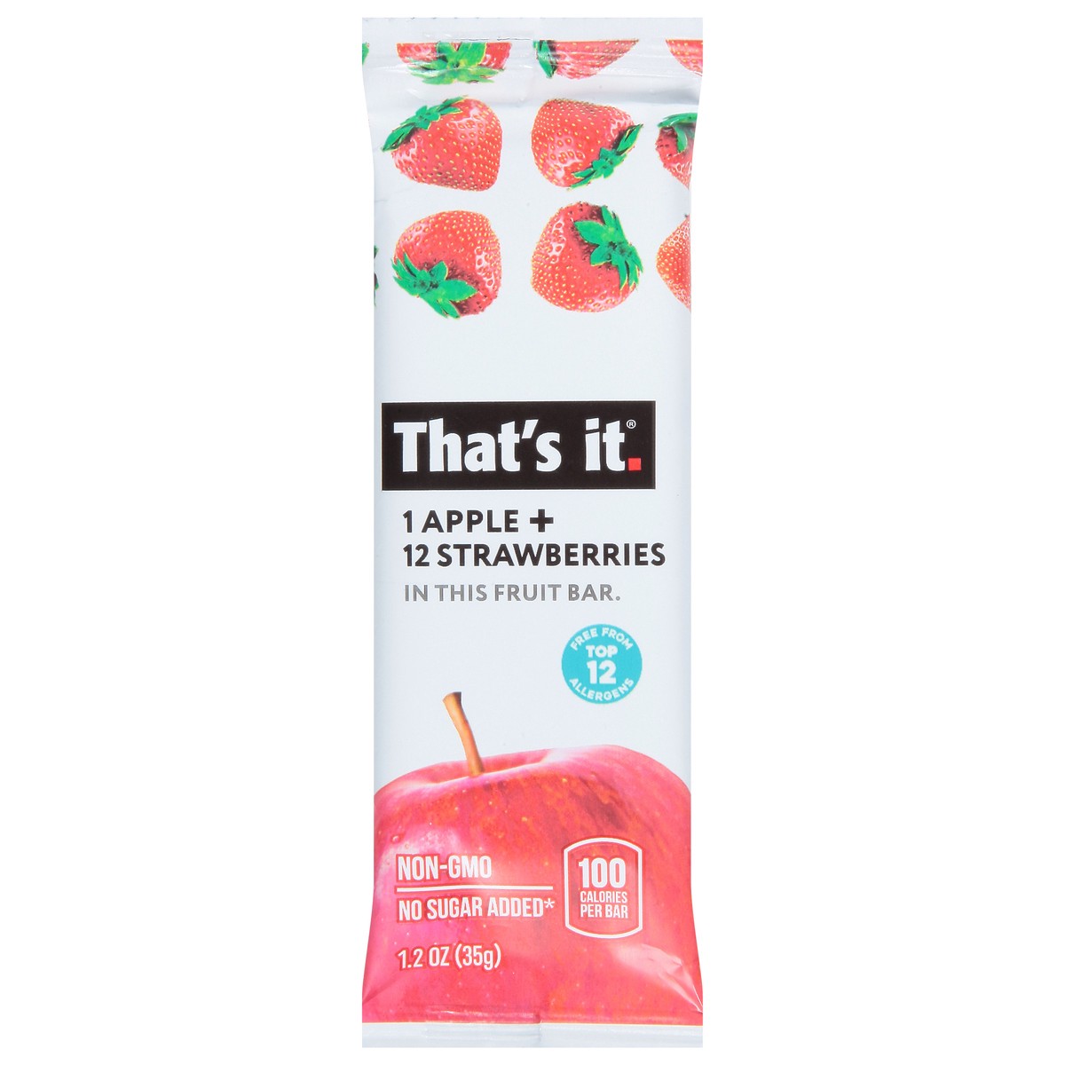Only 2 ingredients, apples and strawberries, in this fruit bar. No added sugar. No preservatives. 100 calories. 3 g of fiber. Non GMO. No fat. All natural. Kosher. Vegan. Raw. USDA recommends 2-4 fruiā¦