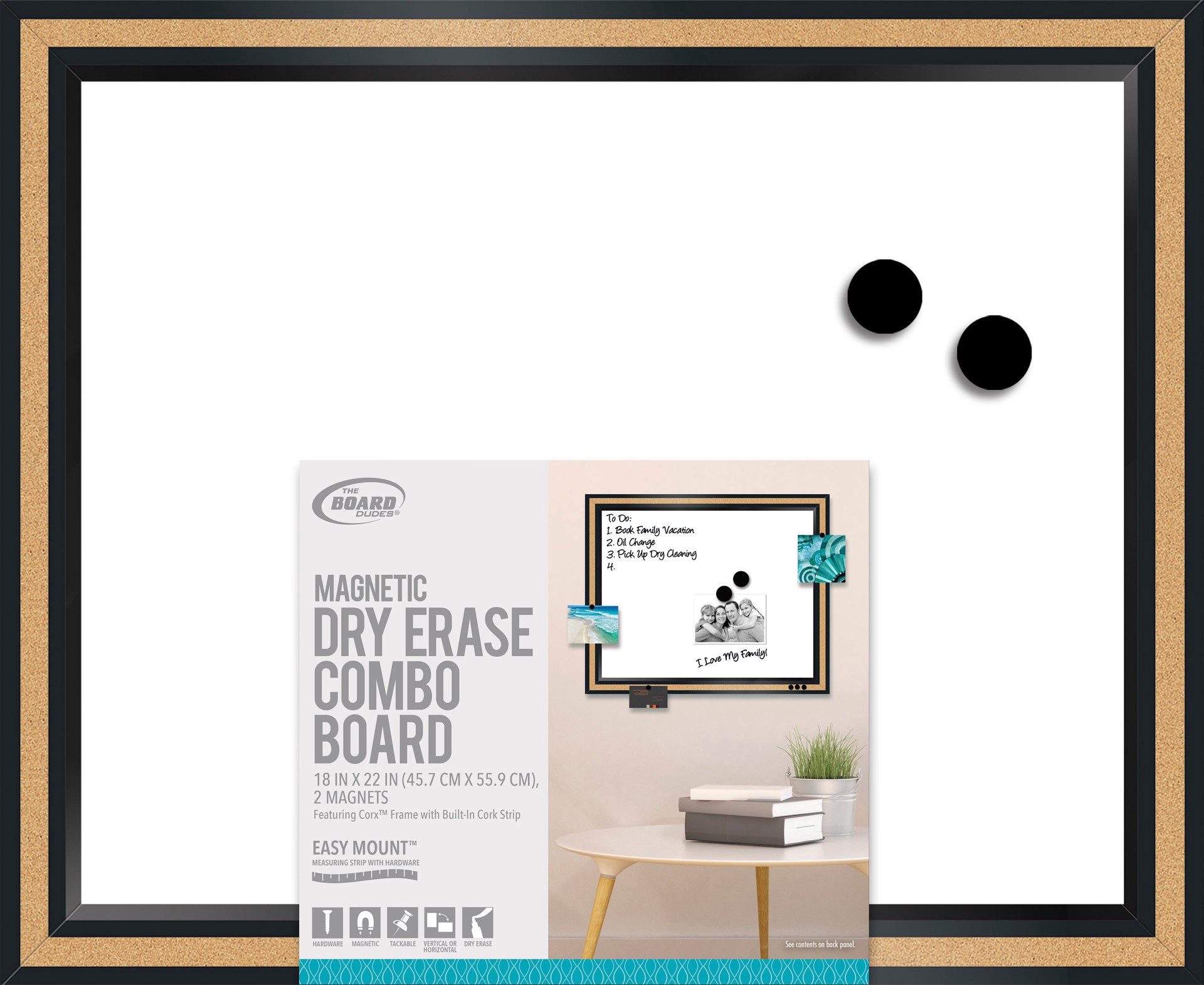 This magnetic dry erase board is encased in a black and cork frame that provides a modern touch to any area in the house. It is perfect for providing anyone with a large, easy-to-use and maintain writ…