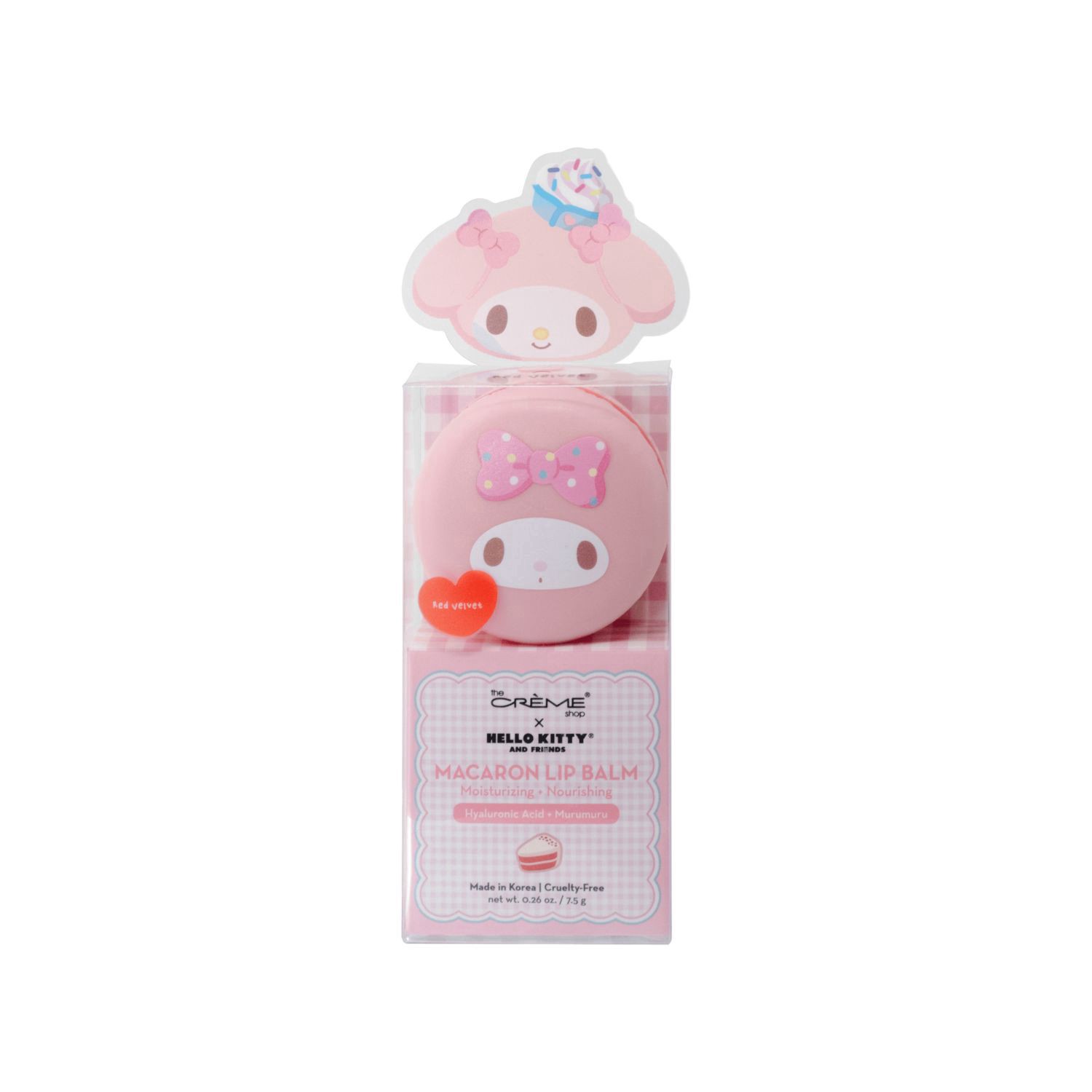 The Crème Shop x Hello Kitty Macaron Lip Balm makes lips as soft and decadent as a freshly baked macaron! Infused with smoothing Vitamin E and moisturizing Shea Butter.